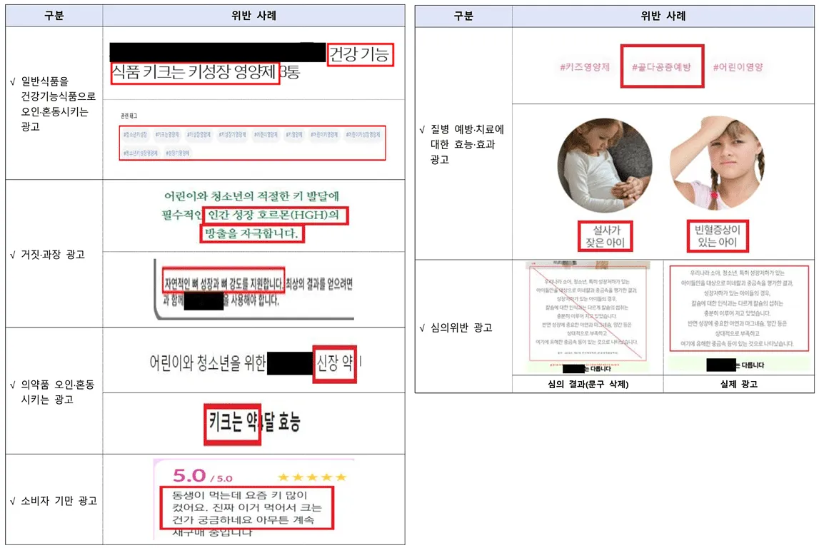- 일반식품을 건강기능식품으로 오인, 혼동시키는 광고 (ex. 키크는영양제, 건강기능식품 키크는 키성장 영양제)