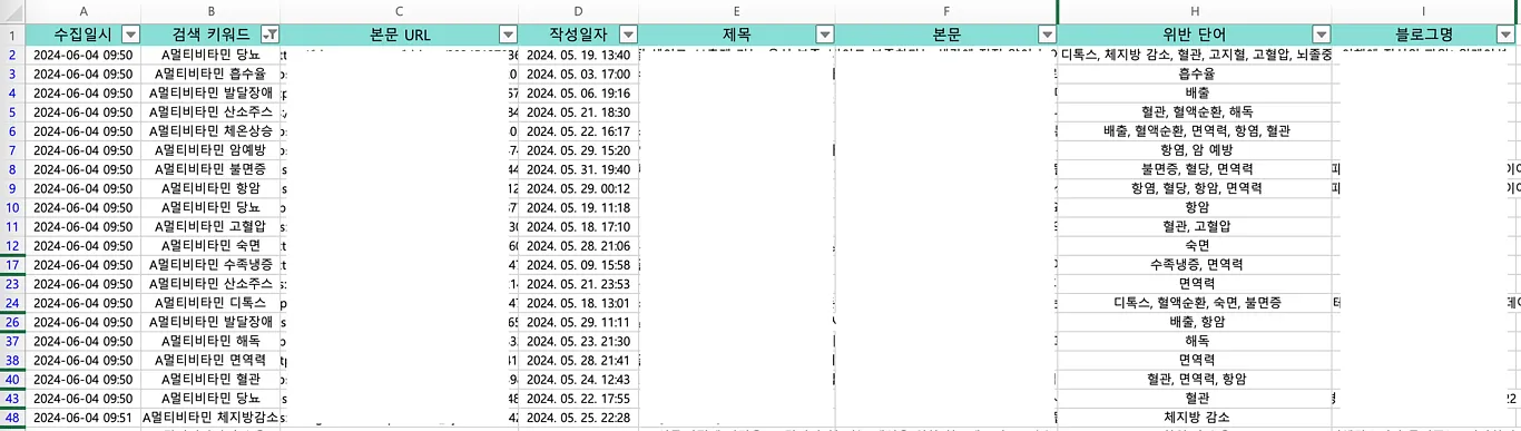 네이버 블로그에서 상품명과 위반단어를 조합한 키워드(ex. A멀티비타민 암예방)로 검색된 블로그를 모두 수집합니다.