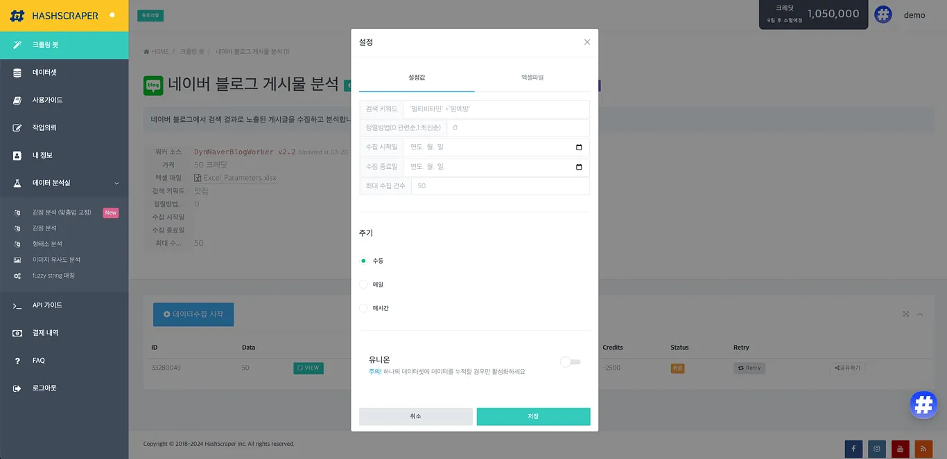 STEP 1. 해시스크래퍼 회원가입하고 네이버 블로그 게시물 분석 크롤러 접근